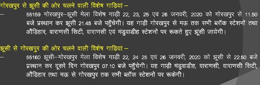 Train No.55159 Gorakhpur- Jhusi fair special train will be departure from Gorakhpur on 22, 23, 25 and 26th January, 2025 at 21.45 pm.